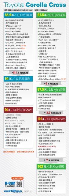 原文連結: https://news.u-car.com.tw/news/article/75868 原文內容: U-CAR 日前才報導過 Toyota Corolla Cross 傳出將進行配備與售價調整的動向,如今 U-CAR 掌握到目前第一線 Corolla Cross 新年式改款確切資訊,新車並未在外觀更動, 主要為全車系升級具有無線 Apple CarPlay 與無線 Android Auto 的 9 吋 Drive+ Link 主機,新年式並未有追加原先外界推測的 12.3 吋數位儀表、電子手煞與 Auto Hold。售價全車系則調漲 0.9 萬至 2 萬不等,全車系價格帶提升到 85.9 萬至 103 萬 。 https://i.imgur.com/YibLfzW.jpg