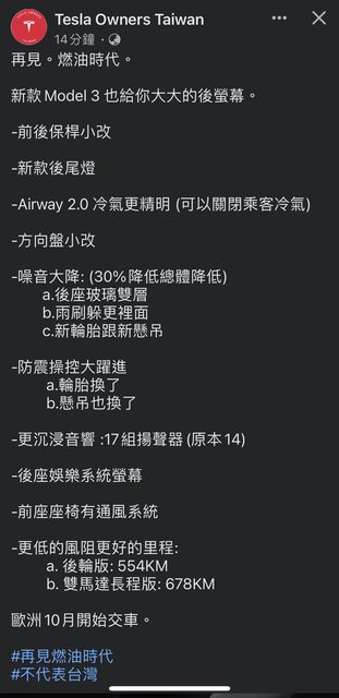 再見。燃油時代。 新款Model 3 也給你大大的後螢幕。 -前後保桿小改 -新款後尾燈 -Airway 2.0 冷氣更精明 (可以關閉乘客冷氣) -方向盤小改 -噪音大降: (30%降低總體降低) a.後座玻璃雙層 b.雨刷躲更裡面 c.新輪胎跟新懸吊 -防震操控大躍進 a.輪胎換了 b.懸吊也換了 -更沉浸音響 :17組揚聲器(原本14) -後座娛樂系統螢幕 -前座座椅有通風系統 -更低的風阻更好的里程: a. 後輪版: 554KM b. 雙馬達長程版: 678KM 歐洲10月開始交車。 #再見燃油時代 #不代表台灣 https://i.imgur.com/ojCUUsT.jpg
