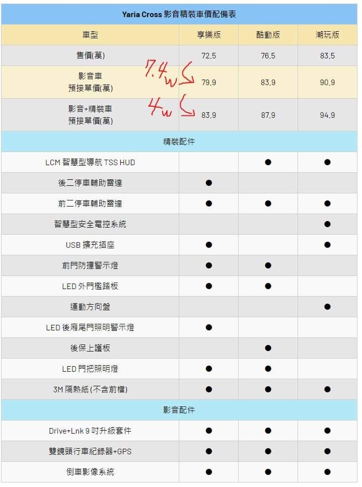 均已 Yaris Cross 預接單價格來堆疊,最終車型正式售價仍待合泰汽車宣布,至於配件套