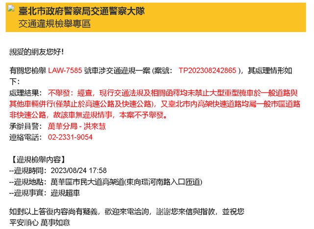 : 萬華警分局回覆:經查,現行交通法規及相關函釋均未禁止大型重型機車於一般道路