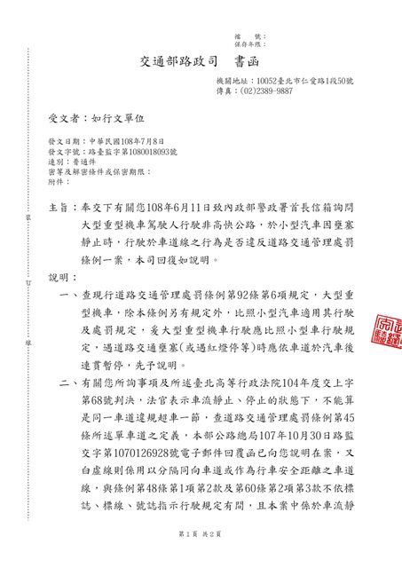 此公文為本人詢問警政署,警政署函文給交通部路政司,路政司再函文給我及警政署