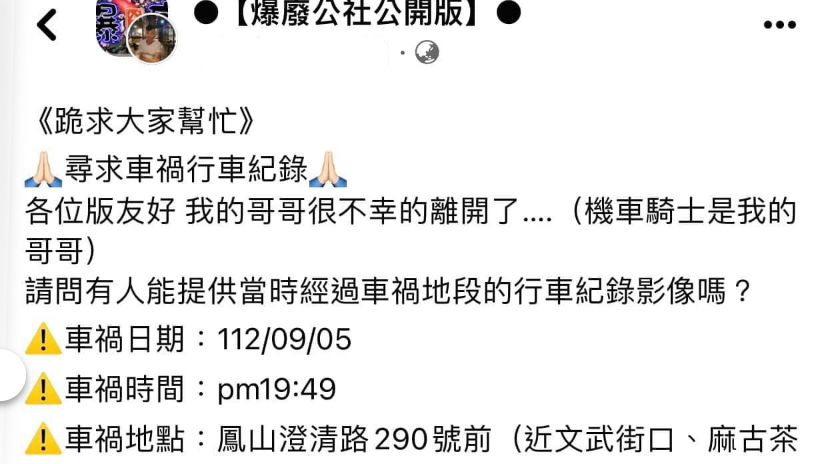 原文連結: https://udn.com/news/story/7320/7429239?from=udn-ch1_breaknews-1-0-news 原文內容: 影/高雄轎車突變換車道 機車騎士煞不及撞上傷重不治 2023-09-10 11:52 聯合報/ 記者石秀華/高雄即時報導 郭姓男子5日駕車行經高雄三民區澄清路與文武街口時,突然變換車道,導致後方機車騎 士王姓男子煞車不及,撞上轎車,人車倒地滑行約3公尺,王男因頭部重創,送醫搶救一 天仍宣告不治,家屬在網路徵求過往行車記錄器,事發影像曝光,只見王撞上轎車後倒地 不起發生意外。 家屬在臉書社團「高雄大小事」委託友人貼文指出,「機車騎士是我的哥哥,哥哥不幸離 開了, 請問有人能提供當時經過車禍地段的行車紀錄影像嗎?」留言令人鼻酸。 三民二警分局警方調查,該起車禍發生在5日晚間近8時許,當時郭姓男子(27歲)駕車沿 沿澄清路外快車道南向北靠右直行,欲右轉建國路,因突變換車道,導致後方同向直行的 機車騎士王姓男子(43歲)煞車不及,直接撞上轎車左側保險桿。 王男機車車身毀損、人倒地不起,警方獲報到場處理,當時王男手腳擦傷、顱內出血,雖 經救護元緊急送醫搶救,仍於隔天晚上7時許宣告不治。 警方當時先對郭男進行酒測,無酒駕行為,王男送醫後經抽血檢測也無酒精反應;郭聲稱 當時欲右轉建國路,未注意後方有騎士。 警方調閱監視器追查,初步研判,郭男變換車道時,未讓直行車先行,已違反道路交通安 全規則第98條第1項6款,另王男亦未保持安全距離,詳細肇因將由交通大隊進一步分析研 判,警詢後,依過失致死罪嫌將郭移送偵辦。 心得/說明:(30字以上) 我行我素牌又一傑作, 完全不看後方的 "王男亦未保持安全距離"??車輛未完成變換車道時無前後車關係 Lexus硬變車道,要怎有安全距離? -- ※ 發信站: 批踢踢實業坊(ptt-site.org.tw), 來自: 1.160.45.190 (臺灣) ※ 文章網址: https://ptt-site.org.tw/car/M.1694320723.A.FC4