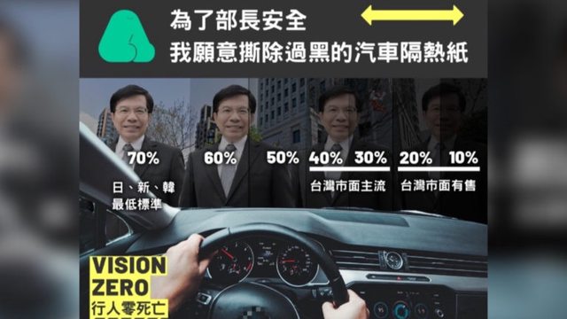 交通部要求行人穿亮一點,卻沒有要求駕駛不要貼過黑的隔熱紙,形同本末倒置。(圖片