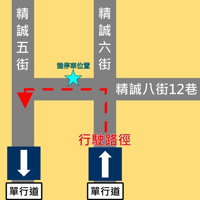 因為六街跟五街各為單行道 所以只能開這條過去精誠五街的目的地