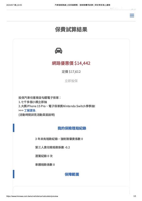 → abab7974: 我看行照沒有特別寫什麼,看保險網站說選價格最接近的 06/07 21:39
