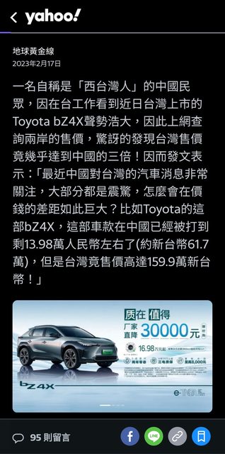 噓 jojochen: 笑死了bz4x在大陸被罵垃圾暴跌,台灣當寶 06/10 01:45