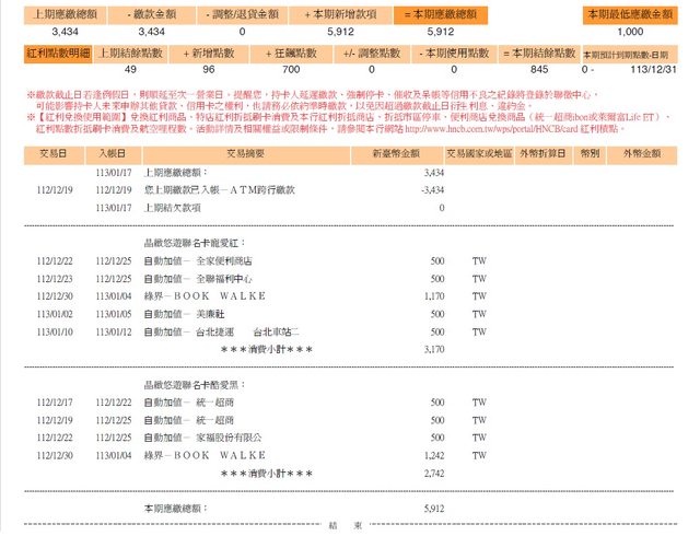 這兩筆消費(1170+1242)得到了新增點數96點,