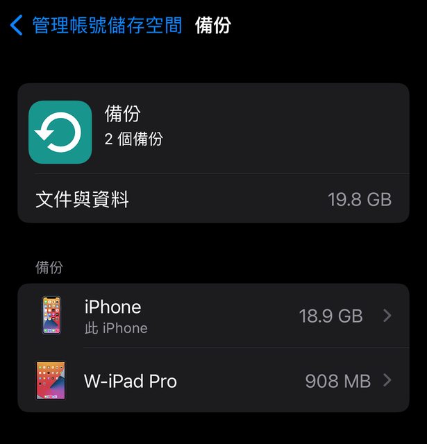 我的兩個設備的備份合計空間大小明明只有19.8G,但在iCloud 卻被吃掉了45G。