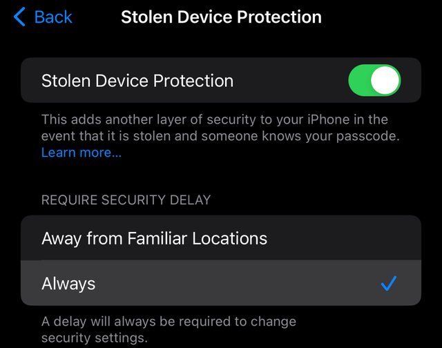iOS 17.4包括對被盜裝置保護的更改。現在使用者可以選擇在更改安全設定時始終要求安全 延遲。以前唯一的選擇是在遠離熟悉的地點時實施延遲。 其他 https://i.imgur.com/Ag7qlZR.png