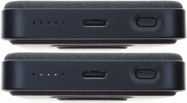 ▼下側面中間有USB-C埠,右邊有按鈕,左邊有無線充電燈號(最左)及4個白色電量燈號,