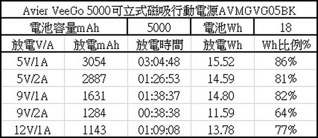 ,12V/1A超過規格標示12V額定電容量750mAh,5V/1A可用Wh比例86%最高,9V/2A可用Wh比