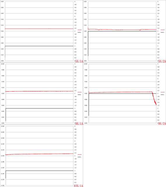 ▼USB-C埠5V/1A、5V/2A、9V/1A、9V/2A、12V/1A放電的電壓電流圖表如下所示,9V/2A接