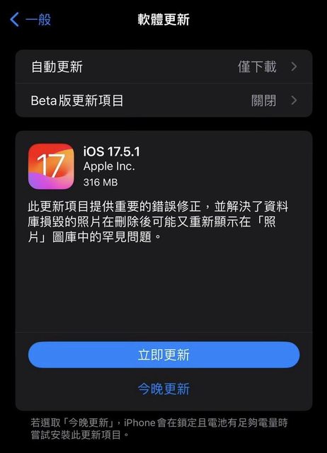 【介紹或心得】 iOS 17.5.1 正式版開放更新 更新內容: 此更新項目提供重要的錯誤修正,並解決了資料庫損毀的照片在刪除後可能又重新顯示在「 照片」圖庫中的罕見問題。 心得: 蘋果緊急更新圖庫的問題,升上去17.5版本的人要趕緊更新比較好,照片都不知道有沒有外 洩…? ---- Sent from BePTT on my iPhone 15 Pro Max -- ※ 發信站: 批踢踢實業坊(ptt-site.org.tw), 來自: 118.231.177.34 (臺灣) ※ 文章網址: https://ptt-site.org.tw/iOS/M.1716251660.A.0BB