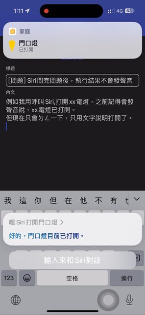 例如我用呼叫Siri,打開xx電燈,之前記得會發聲音說,xx電燈已打開。