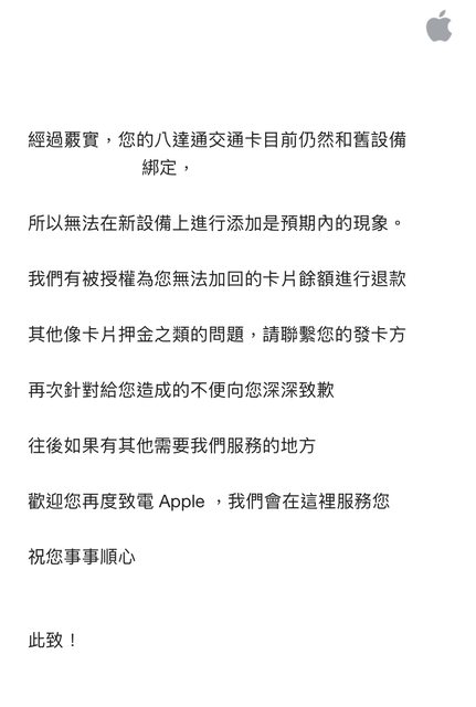 Apple表示後台看我的八達通卡在舊設備內,但由於舊設備已經被直營店收回,