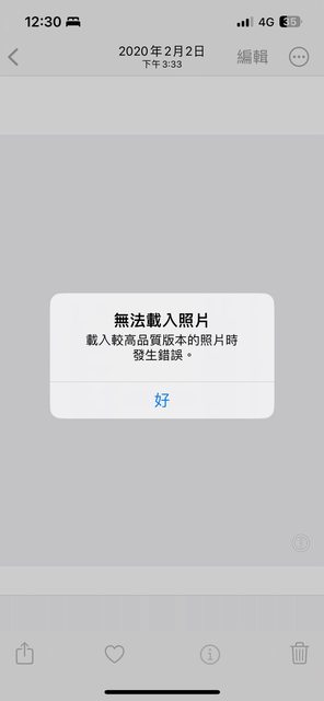 問題描述:大約2021以前的照片會無法載入,變成一片空白,點選右下角的驚嘆號會顯示