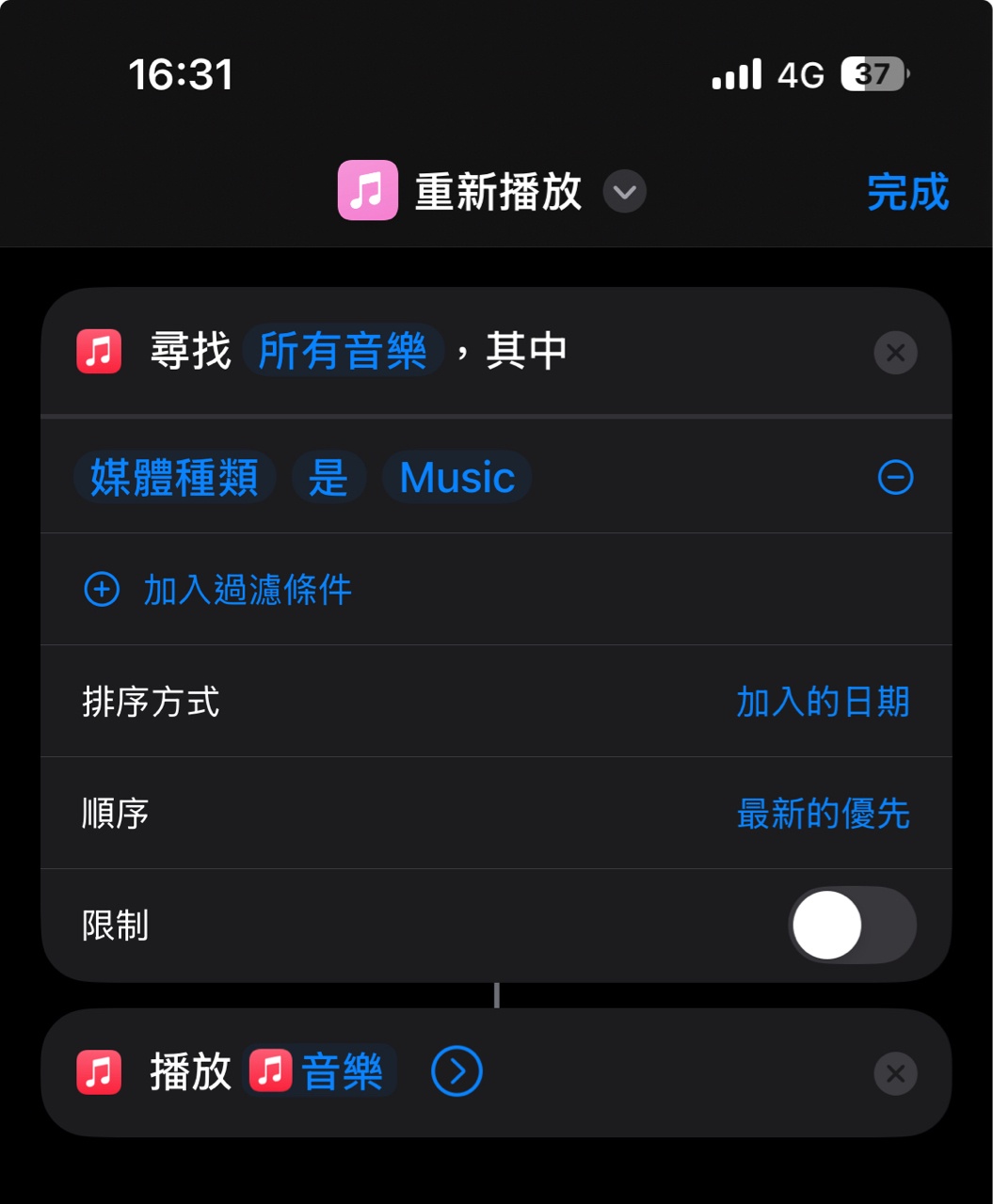 以前有用一個播放「最近加入」音樂的捷徑,可以實現從「最後一個」加入資料庫的歌曲