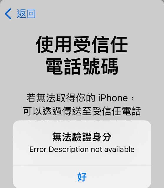 不到驗證碼,因此Apple ID帳號目前被鎖住7天,試到系統出現無法驗證身份…