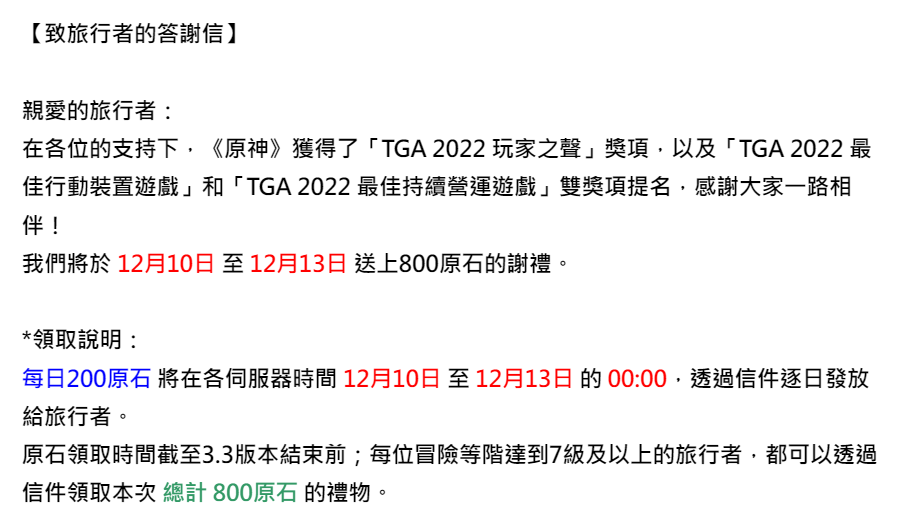 親愛的旅行者: 在冒險的旅途中,我們一同創造了無數美好的回憶。在各位的支持下,《原神》獲得了「Pl ayStation® PARTNER AWARDS 2023 GRAND AWARD」, 我們將於12月2日 - 12月5日送上800原石的謝禮,感謝相伴。 *領取說明: 12月2日 - 12月5日期間,每日將在各伺服器時間的 00:00,透過遊戲內信件逐日發放200原 石給旅行者。 原石領取時間至4.2版本結束前,每位冒險等階達到7級及以上的旅行者都可以透過遊戲內信 件領取本次總計800原石的禮物。收取信件後,信件有效期限為30天,請旅行者及時領取。 原又贏 https://i.imgur.com/01NJEpO.jpeg