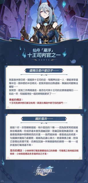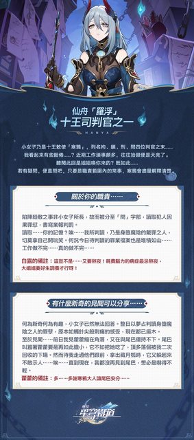 小女子乃是十王敕使「寒鴉」,列名拘、鎖、刑、問四位判官之末…… 我看起來有些睏倦……?近期工作瑣事頗多,往往抬眼便是天亮了。 聽聞此回是姐姐喚你來的?既如此……若有疑問,便直問吧,只要是職責範圍內的常事,寒 鴉會盡量解釋清楚。 https://i.imgur.com/Eyqt9a8.jpg