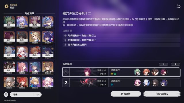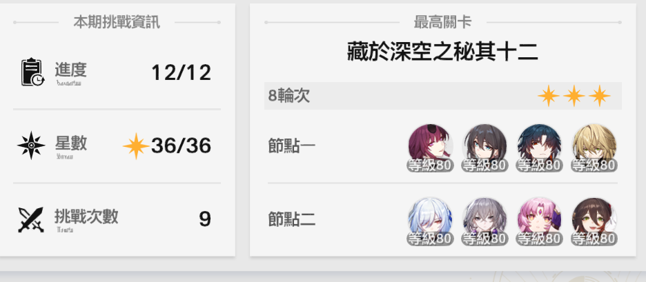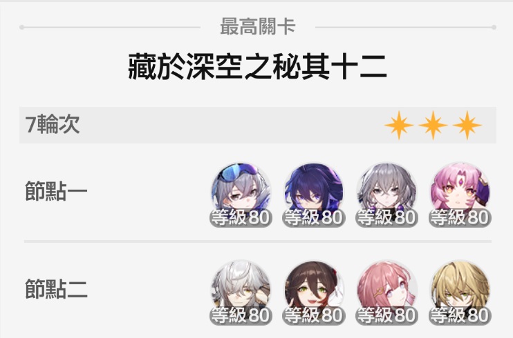 這次鐵道深淵多了11、12層 我沒錢課金 角色都只有0命 頂多0+1 剛剛打12層根本滿不了星 https://i.imgur.com/UfGZTC1.png