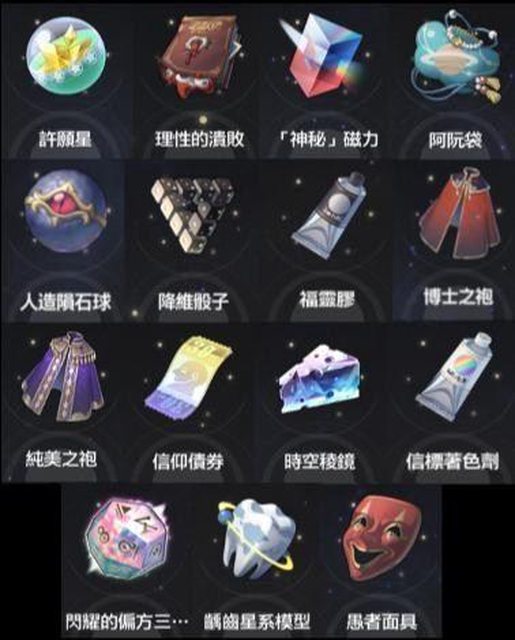 每經過一次商店就是把各命途火漆、測不準匣、阿阮袋、血錦之紀徽章、人造隕石球這些