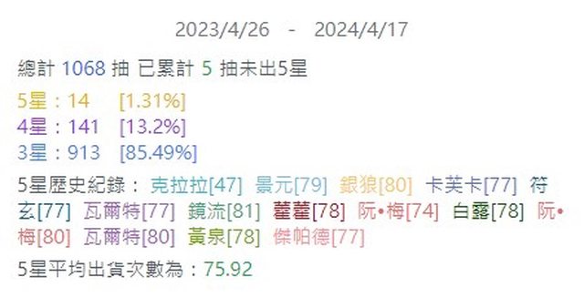 → LeonBolton: 每抽0.6%出金,含綜合保底1.6%;約74抽後,每一抽多 04/17 23:54
