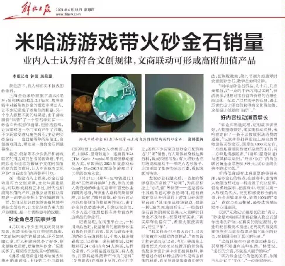 寶石產生了興趣。不少玩家受到遊戲角色吸引,主動購買砂金石——也就是俗稱的東陵玉,