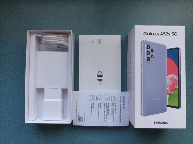 盒裝內含:A52s本機、盒裝內原廠充電線組(未使用)、清水套、SIM卡針