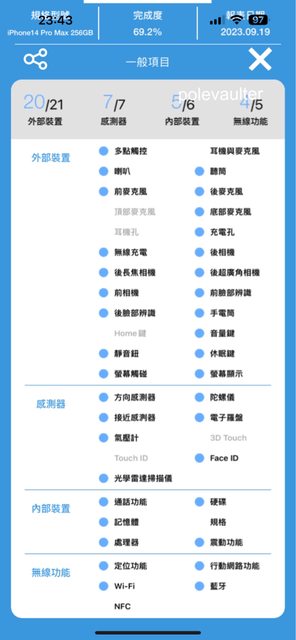 有痕跡,電池健康度87%,經由手機醫生app檢測皆功能正常(如下圖所示)。