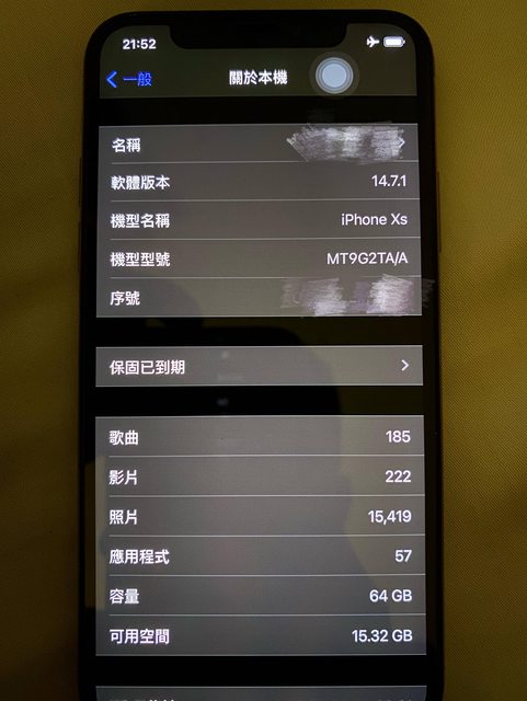 欲售物品:iPhone XS 64GB 金 物品狀況:一手 購買來源:新光三越 盒裝內含:盒裝,說明書 購買日期:2018 保固日期:過保 購入價格:3萬多(實際多少有點忘了) 欲售價格:NT$ 5000 交易方式:面交 實品圖片: 電池健康度86%* 四角皆無碰撞及傷痕