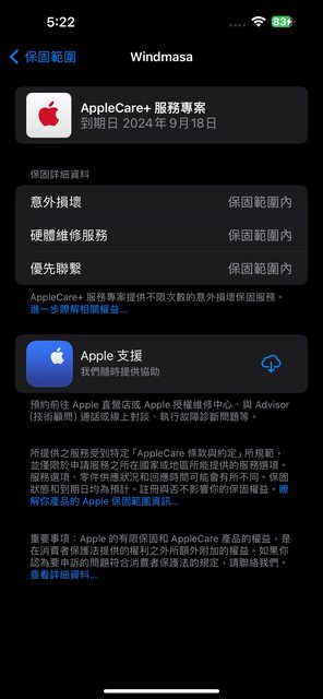 有購買Apple Care + 保固到2024/9/18