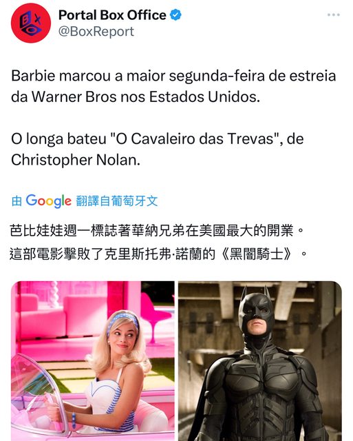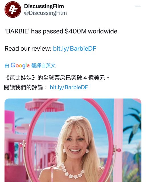 推 GEKKAKAJIN : 恭喜芭比,華納今年就靠她賺回一點面子XD 07/26 09:07