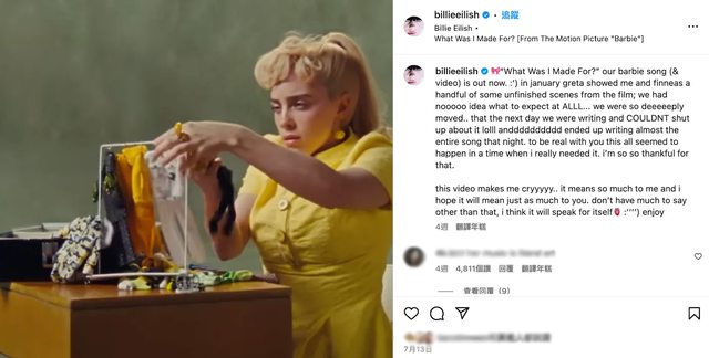 Billie Eilish 獻唱《芭比》電影主題曲。圖/截自 billieeilish@Instagram