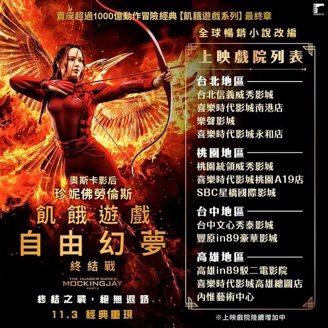 標題[情報] 《飢餓遊戲:自由幻夢 終結戰》上映戲院