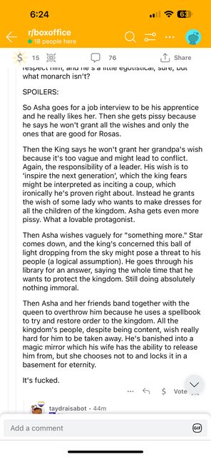 是的劇情就是如此弱智 女主是國王學徒,一次許願大會上,國王不給女主爺爺實現願望,因為他說他願望是啓發 後代(inspire future generations)。國王說這願望太寬鬆有可能會產生問題。所以給另 一個大媽實現願望希望全國小孩都有新衣。女主因而對國王肚爛。 女主私下許願 something more 一個星星天降(機械神勒?) 國王知道後去圖書管找尋著 星星來歷擔心會對國家有害(合理)因為未知所以想要處理掉這星星。 女主與朋友說服皇后對抗國王說因為這是虛假的繁榮,人民沒有自由意志(問號) ,皇后同意幫忙(問號),最後聯合全國人民一起許願放逐國王到一個魔鏡世界(問號)。 彩蛋所有迪士尼公主出來暗示這是公主宇宙,國王變成日後的魔鏡(本來要接白雪公主吧) ,女主暗示為日後神仙教母(又洗黑) 國王從頭到尾都是沒做錯什麼大事只想保護繁榮國家。沒反轉。 片長不含彩蛋78分鐘,所以塞了歌舞後很趕沒鋪陳。 -- ※ 發信站: 批踢踢實業坊(ptt-site.org.tw), 來自: 172.56.232.113 (美國) ※ 文章網址: https://ptt-site.org.tw/movie/M.1700237279.A.272