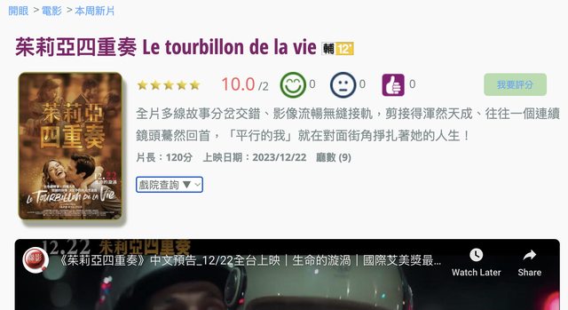 早上起床看看這週有什麼新片,看到我今年最愛的法片 Le tourbillon de la vie我曾直譯《生命的漩渦》,當時看了就熱血沸騰希望有天台灣也能上院線,結果今日真以《茱莉亞四重奏》之名上了台灣院線,在此向聯影致謝、我今天也會去看片約會!