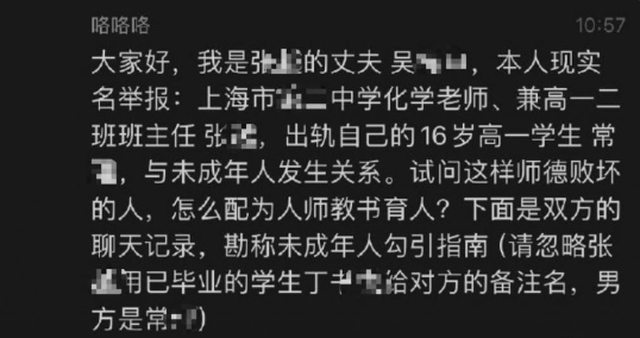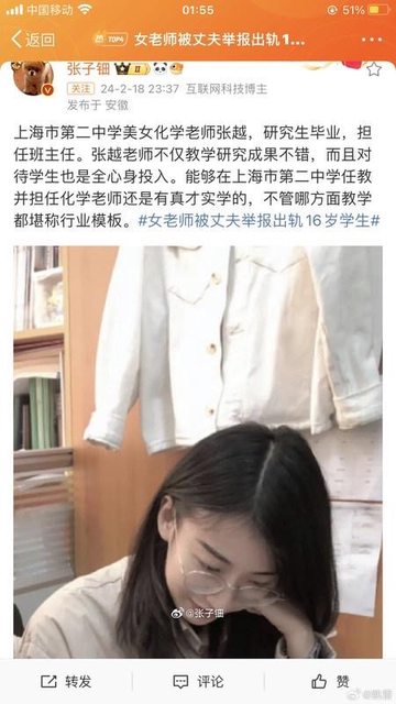 ▲網傳上海中學女教師被丈夫公開舉報出軌16歲學生。(圖/翻攝自網易新聞) 記者鄭思楠/綜合報導 上海市徐匯區某中學25歲女教師被丈夫實名舉報,出軌16歲學生的對話截圖流傳網路,並 登上微博熱搜,引發公眾關注。 對話截圖顯示,兩人已發生關係,尺度超大。 2月19日上午,徐匯區教育局回應稱,已經知曉此事,「現在正在調查中。」 2月16日上午,自稱為上海市徐匯區某中學化學老師兼高一班主任(台稱:班導師)丈夫 的微信用戶,實名轉發公開了自己的張姓妻子與16歲高一男學生的微信對話截圖,斥責妻 子「出軌」、「與未成年人發生關係」。 https://i.imgur.com/62qMt0f.jpg
