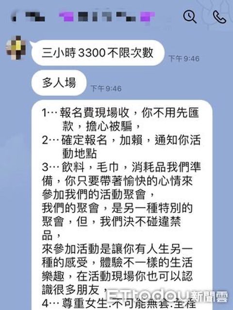 內容,並私訊向洽詢網友說明性愛派對時間、地點及費用為3000元至3300元不等。