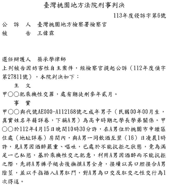 學弟在隔天酒醒之後,覺得後面痛痛的才驚覺被王男性侵,憤而報案提告,桃檢複訊後依