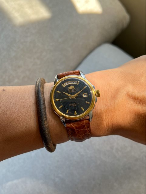 3.東方orient day date自動上鍊機芯,半金外殼搭上黑色波紋面盤,走時日期星期正常