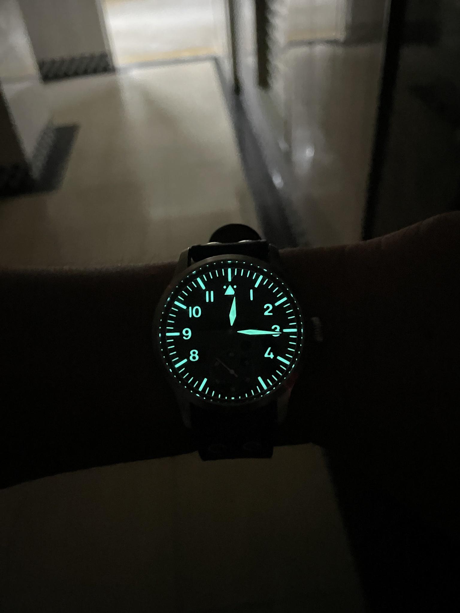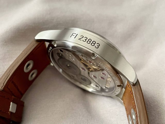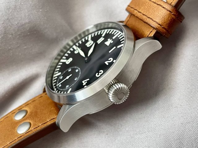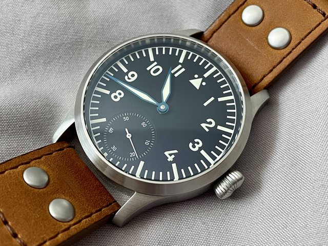 近全新,僅錶帶有些微使用痕跡。具有各種經典德國飛行錶元素:洋蔥大錶冠、藍鋼夜光指