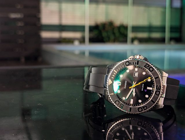 改黑色遊艇圈、藍寶石玻璃、閃電秒針、黃色內圈、三板帶+FKM膠帶,換下零件錶帶皆在,適合日常粗戴,錶帶正常使用痕跡
