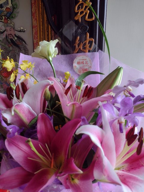 再走往廟裡向媽祖再敘述條件後,捧花過爐