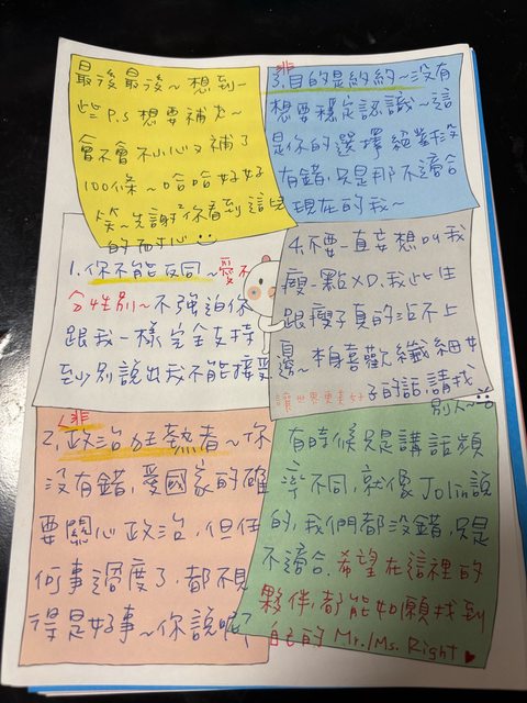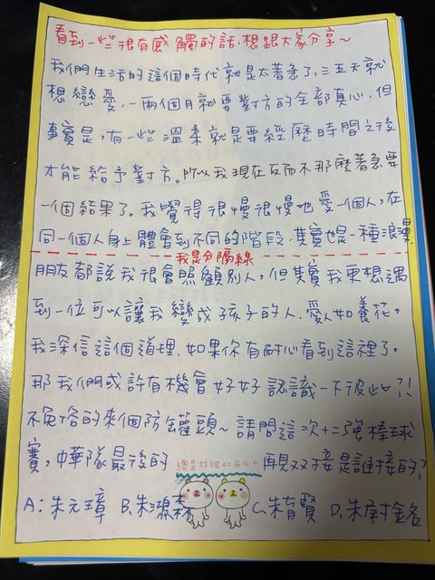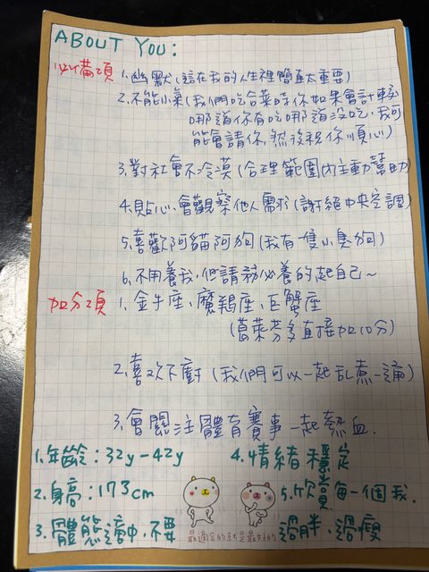 想說的話都在上面 如要來信請務必附上照片~ 工作關係有時候真的無法即時立刻馬上回信 再請您稍等一下~ 謝謝:) ——-有認真看上面手寫的就可以跳過下面了—— 嗨~大家好!我是三弟,也可以叫我珊迪~沒想到距離上一次發文八年後的今天,我又出 現在這兒了。我還是想用最喜歡呈現的方式-手寫,來認識大家:) About me 女生、35Y、163.8cm(號稱164)、天蠍座、金融業(銀行)、雙北生活。其實我不太喜歡 用上述這些少少的文字來過濾(或被過濾)一個人。但姊姊總是得跟上時代(?北漂第12 .5年,回頭看最常問自己的問題就是:「我一定要一直待在台北嗎?」但想歸想,的確也 發現原來早就適應了。最近的12強喚醒了看棒球的熱血心情,終於沒有再吃鍋貼,終於拿 了棒球三大賽事其中的一罐。感動之餘,也驚覺想找一位隊友來共同分享這份喜悅。 平常的生活大都是公司—家裡—瑜伽教室,批踢踢就是個小型社會,35歲可能會有人覺得 已經是阿姨?但我覺得現在的我很好,也喜歡現在的自己。 ESFJ,在不同的年紀都有測過,結果都是同一種。真的有點疲憊了,所以這次我想要慢慢 來,慢慢了解。然後就不要再換了~好嗎? 重要的朋友生日時,還是喜歡手寫的溫度,平常喜歡玩玩空中瑜伽,但我可能跟一般大眾 想拍美照的想法有些許不同…XD 我熱愛這種真實感~(如附圖)這真的hen痛~但成功了 又好有成就感,你說是不是很m?(笑。平常總是內心會有100個小劇場,天性所致。的確 比起需要我去接你嗎?我更喜歡我去接你!偶爾會去爬爬山,但因體力太菜鳥,大都是輕 鬆走走路線目標是不要成為全隊的拖油瓶:P 自從健身教練去國外工作後,就沒有再踏入健身房重訓(掩面 希望你偶爾也可以找我去 動動,不過我很廢就是了~haha About You 必備項: 1.幽默(這在我的人生裡簡直太重要) 2.不能小氣(我們吃合菜時,你如果會計較拿到你哪道有吃哪道沒吃,我可能會請你吃飯 ,然後祝你順心) 3.對社會不冷漠(合理範圍內主動幫助) 4.貼心會觀察他人需求(謝絕中央空調) 5.喜歡阿貓阿狗(我有一隻小臭狗) 6.不用養我,但請務必養得起自己~ 加分項: 1.金牛座、魔羯座、巨蟹座(葛萊芬多直接加10分) 2.喜歡下廚(我們可以一起亂煮一通) 3.會關注體育賽事一起熱血 年齡範圍:32Y-42Y 身高:173 ↑ 生活圈最好在新竹以北 體態適中不要過胖過瘦 情緒穩定 欣賞每一個我 看到一些很有感觸的話想跟大家分享~ 生活的這個時代就是太著急了,三五天就想戀愛,一兩個月就要對方的全部真心。但事實 是,有一些溫柔就是要經歷時間之後才能給予對方。所以我現在反而不那麼著急要一個結 果了。我覺得很慢很慢地愛一個人,在同一個人身上體會到不同的階段,其實也是一種浪 漫。 ————-我是分隔線———————— 朋友都說我很會照顧別人,但其實我更想遇到一位可以讓我變成孩子的人。愛人如養花, 我相信這個道理。如果你有耐心看到這裡了,那我們或許有機會好好認識一下彼此?! 不免俗地來個防罐頭~請問這次12強棒球賽,中華隊最後的再見雙殺是誰接的? A:朱元璋B:朱鴻森C:朱育賢 -- ※ 發信站: 批踢踢實業坊(www.ptt-site.org.tw), 來自: 123.195.5.97 (臺灣) ※ 文章網址: https://www.ptt-site.org.tw/AllTogether/M.1732721004.A.8DE