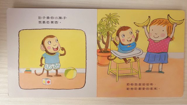 像是吃香蕉這本 把想吃香蕉的小猴子放進娃娃椅、它自己拿起湯匙時幫它拍拍手、擦口