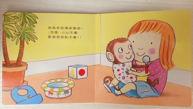 念到現在講到關鍵字時 我女兒會幫小猴子拍拍手 做擦地板的動作 唸到最後再把女兒抱