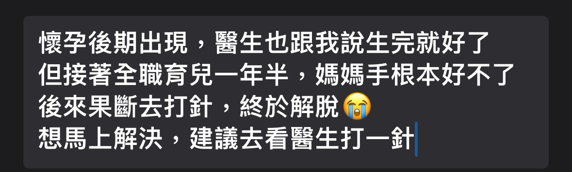 推 YING7 : 我懷孕後期開始痛左手,生完之後變雙手,直到產後3 12/04 17:44