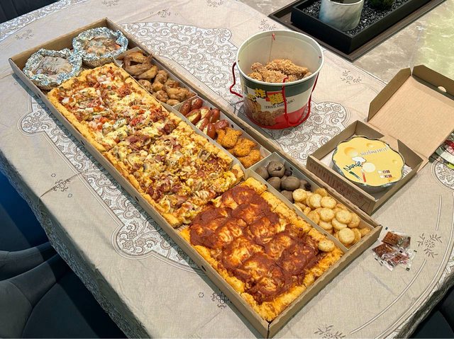 連鎖披薩店有推出「一公尺派對巨飽盒」,內容物還蠻多的,但當天太忙根本也沒吃到多