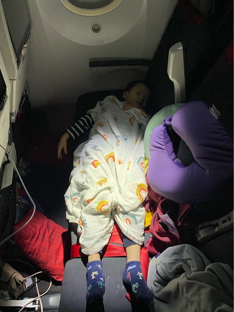 然後就乖乖躺下睡了,一直睡到降落前約2.5小時起來吃早餐;小隻的也在起飛後順利奶